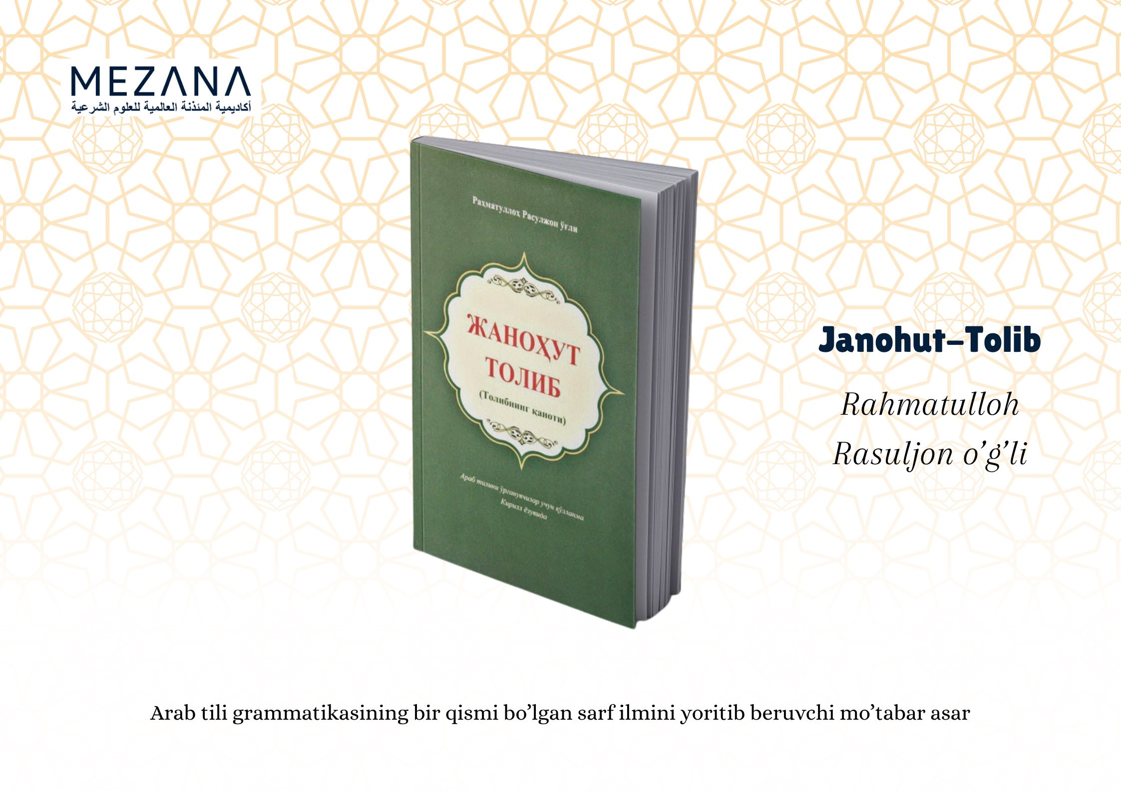 "Janohut Tolib" — arab tilining sarf ilmi (so‘z yasalishi va o‘zgarishi)ni o‘rgatishga mo‘ljallangan boshlang‘ich darslikdir. O‘zbek tilida yozilganligi sababli, yangi o‘rganuvchilar uchun juda qulay va tushunarli. Har bir dars nazariy va amaliy mashqlar bilan mustahkamlangan. Kitob ko‘plab madrasalarda sarf ilmining kirish darsligi sifatida keng qo‘llaniladi.